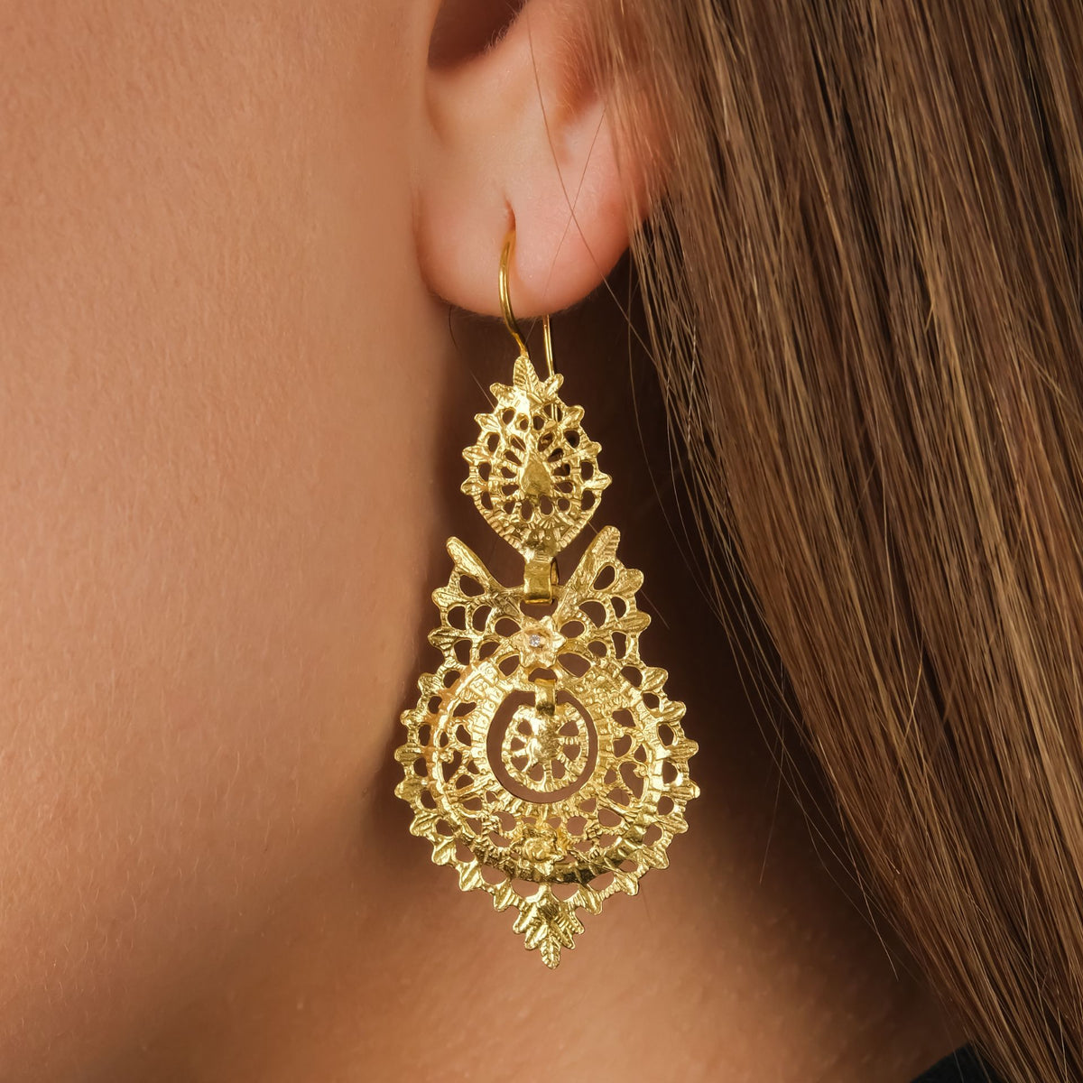 Also called "mulher rica" and "mulher fidalga", among others, the Queen Earrings are a type of earring that started to appear as an adornment in the ears of girls and women from the reign of Queen Maria I, in the second half of the 18th century, but which only gained frank popularity in the reign of her great-granddaughter Queen Maria II in the mid-19th century, and which is still very much appreciated by women, even among the younger strata today.