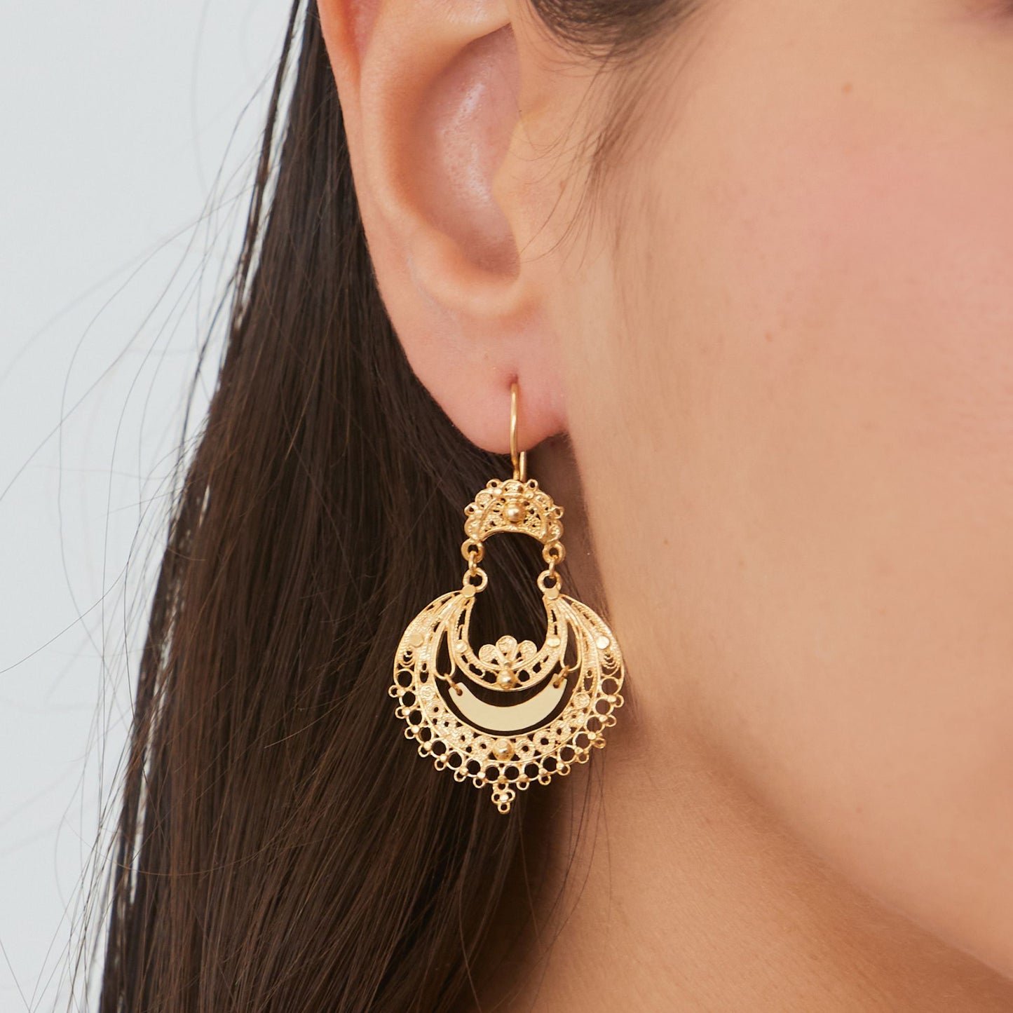 The arrecadas earrings are one of the most characteristic jewels of Portuguese goldsmithing, used since ancient times in the North of Portugal. The technique of stretching the precious metal wire and shaping it into intricate decorations became popular in the 20th century.