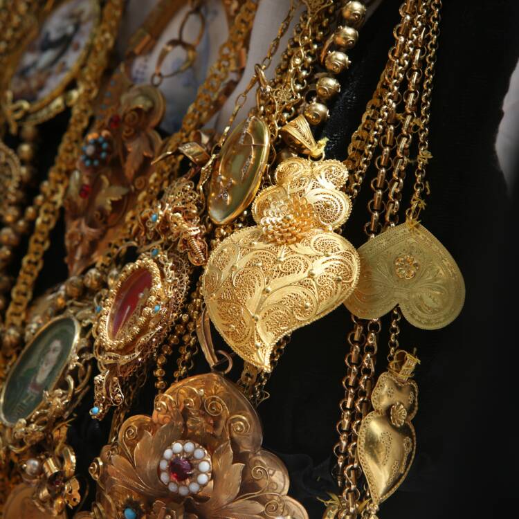 The Festive Costumes worn by the women of Viana do Castelo are richly detailed garments, often associated with festive moments, both religious and social. For these special moments, accessories like the Relicário XL Necklace in Gold-Plated Silver are the perfect choice, bringing an aura of tradition and spirituality to the ensemble.