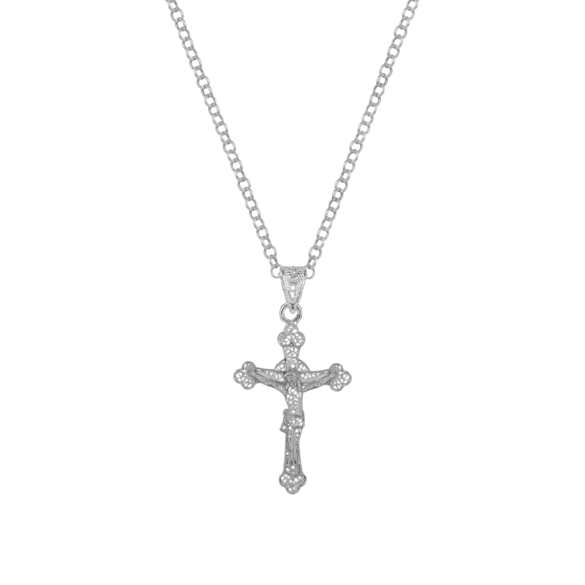 Crucifix filigree necklace in silver.
