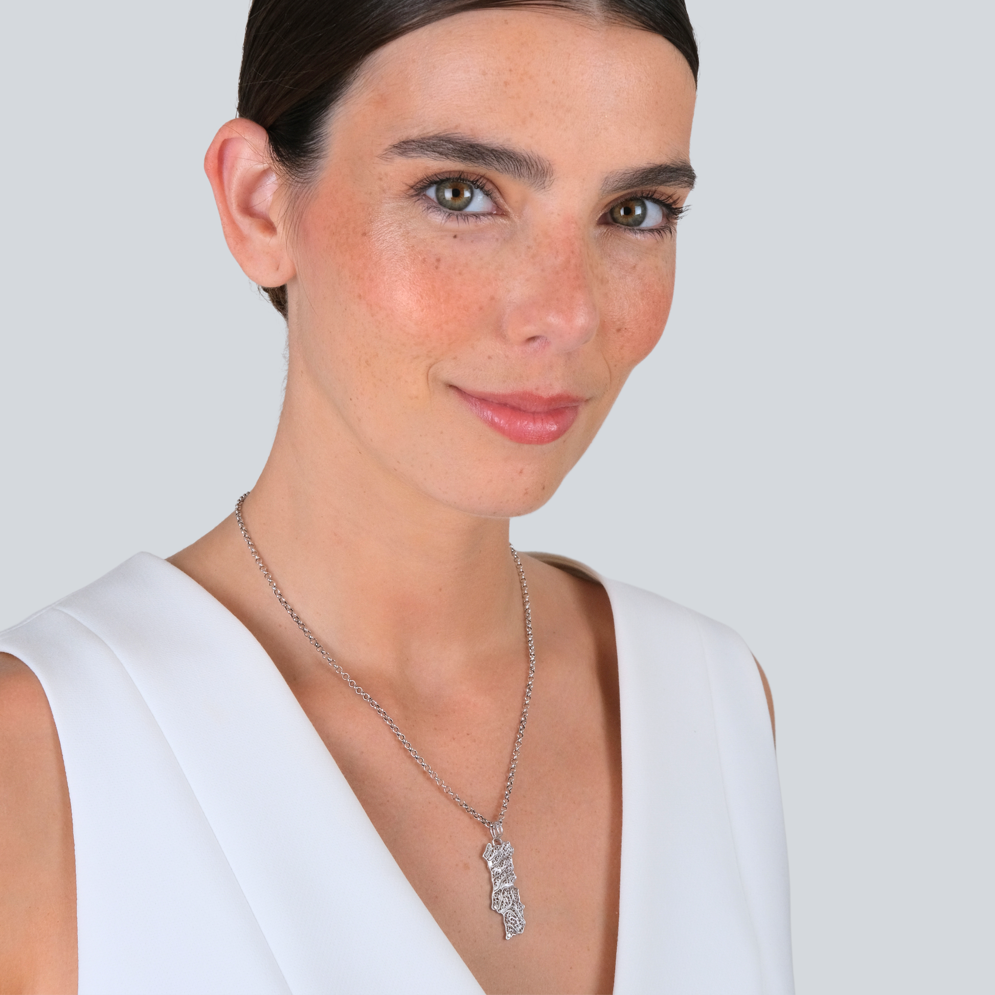 Silver necklace in filigree, with the map of Portugal. You can see the major cities and rivers in the filigree map.
