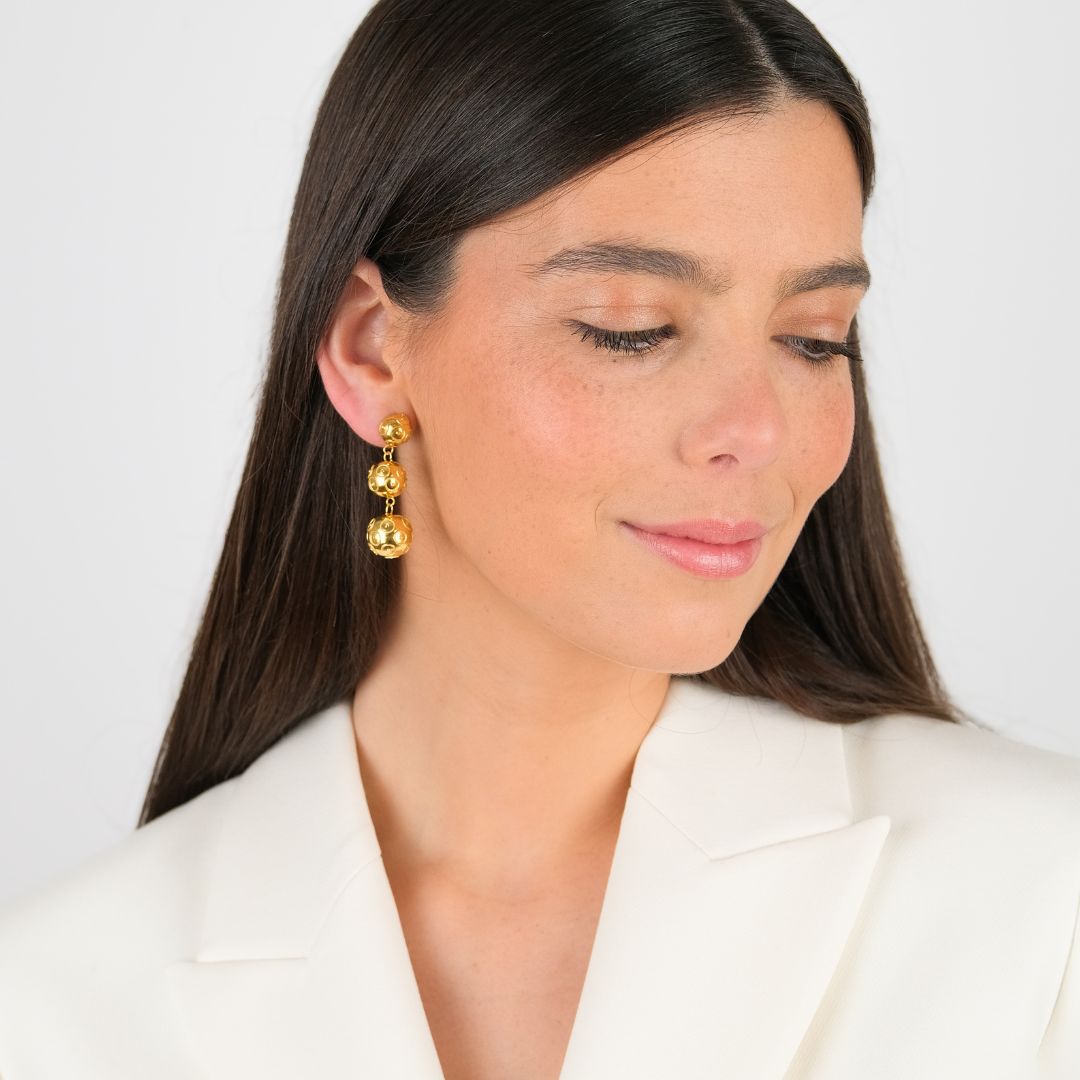 Pendientes de plata 925‰ bañada en oro de 4cm y 8gr. Las tres cuentas tienen diámetros de 10 mm, 12 mm y 14 mm. Hecho a mano en Portugal.