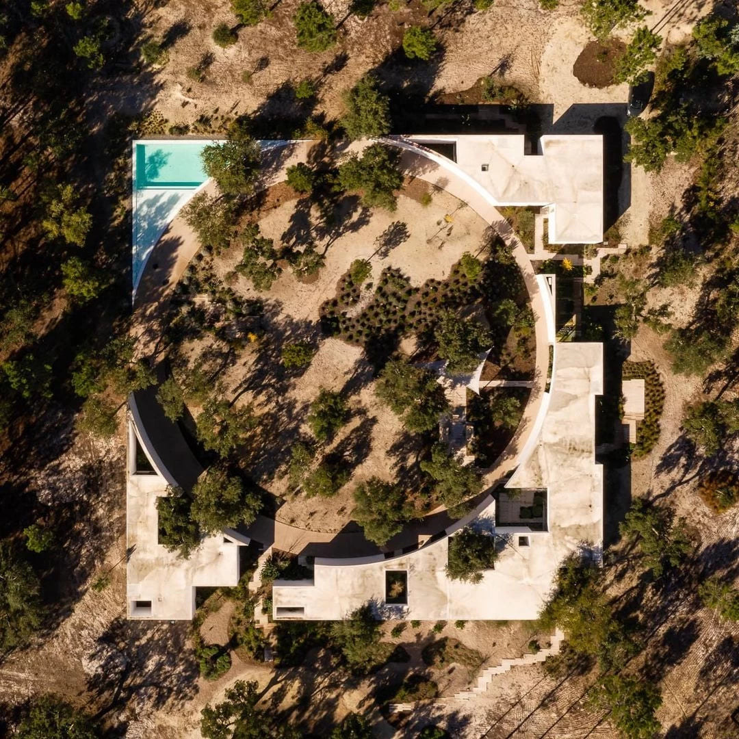 Designed by the Portuguese architect Aires Mateus and located in the parish of Melides, inSetúbal, this building stands out for its circular shape when seen from above. Characterized by the use of contemporary lines, this house is a manifestation of the use of geometric shapes in renowned Portuguese architecture.
