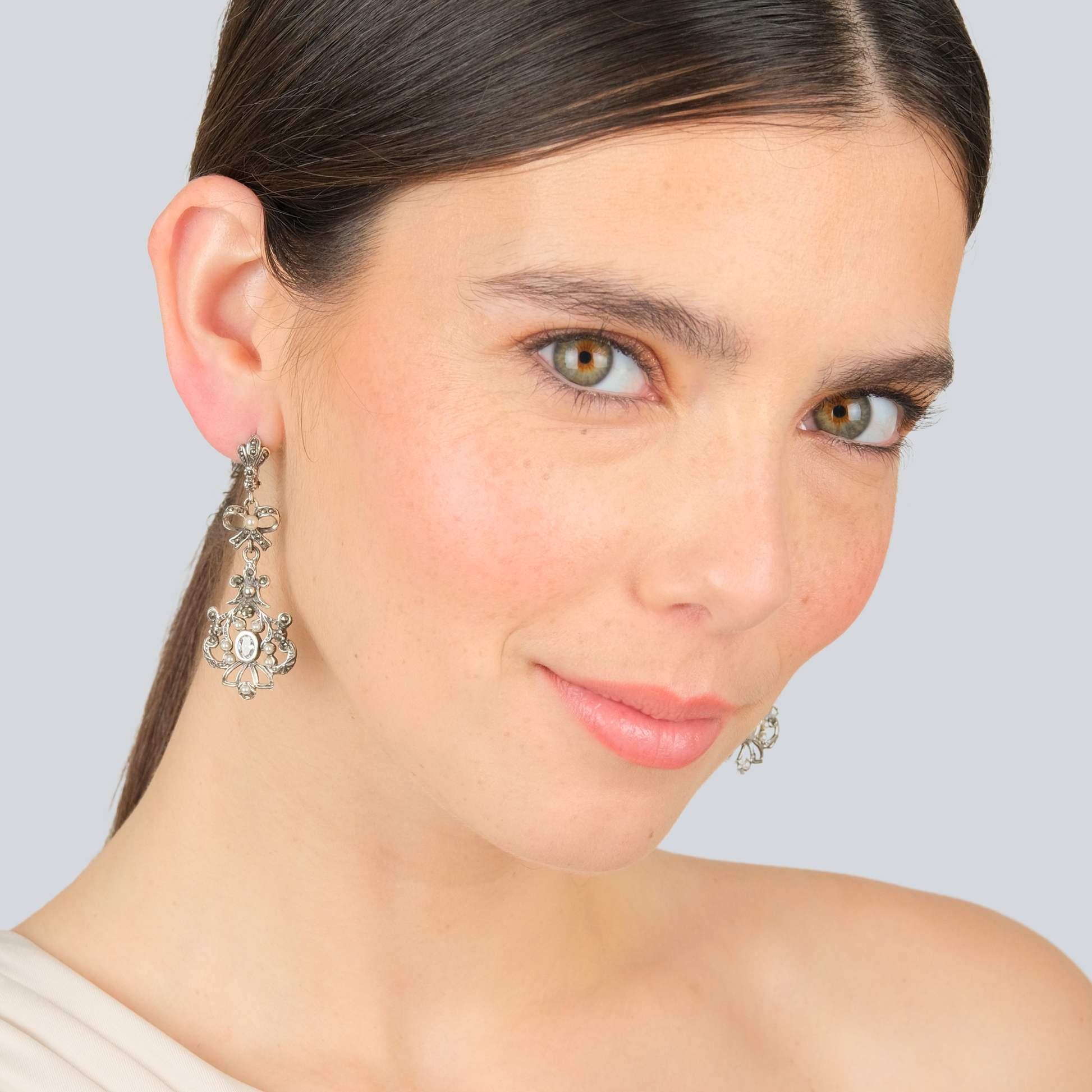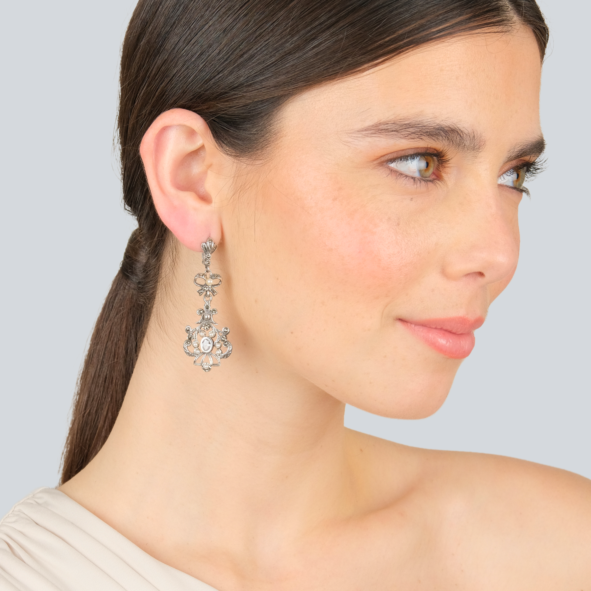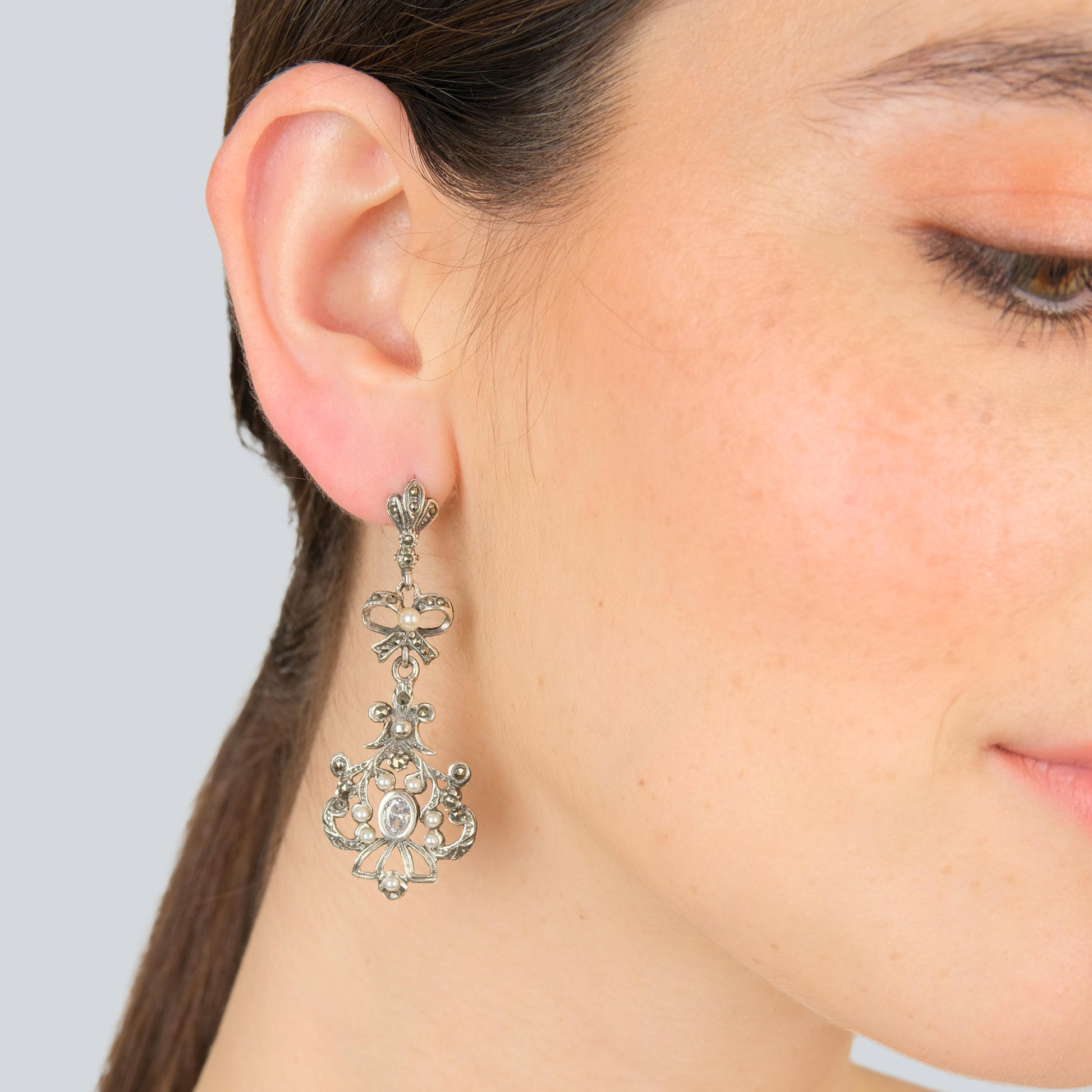 Brincos Catarina com Marcassites e Pérola da Coleção joias de Marcassites.