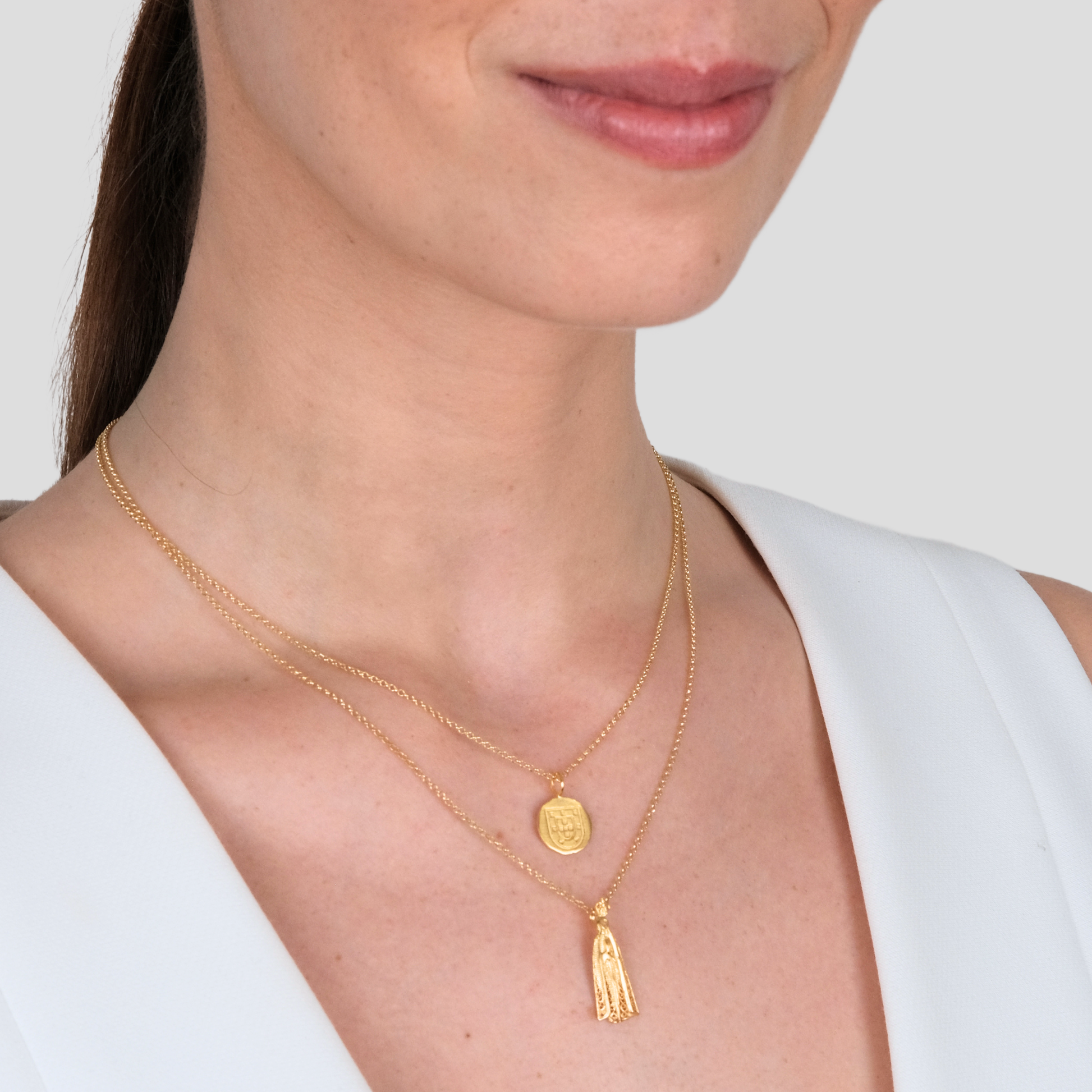 Conjunto de dois colares em prata dourada, incluindo o Colar Escudo e o colar Colar Nossa Senhora de Fátima.