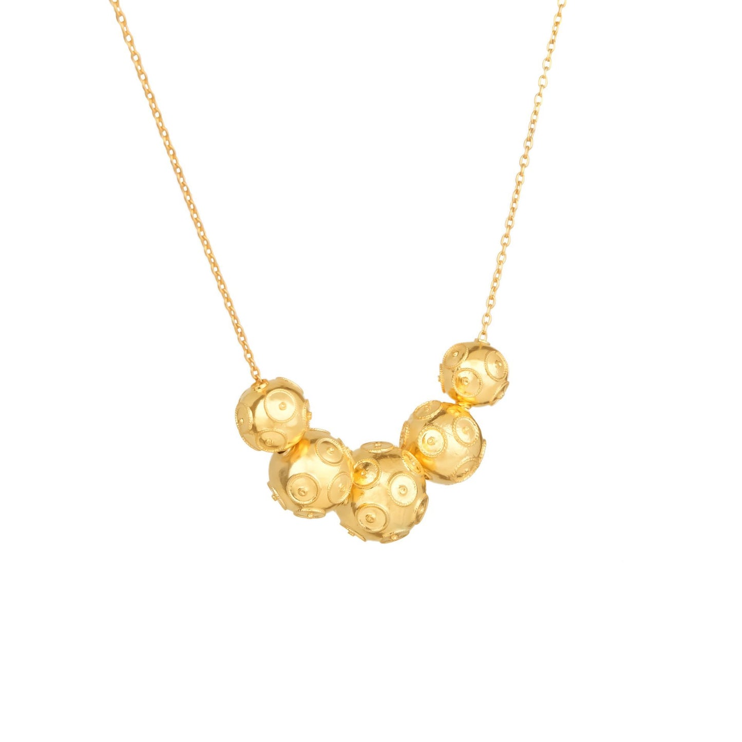 Colar em prata dourada 925‰ com 45cm e 7,6gr. As cinco Contas têm 10mm, 12mm e 14mm de diâmetro. Feito em Portugal.